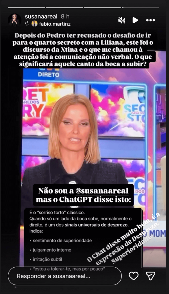 A profiler deu-se ao trabalho de pedir ao CHAT para interpretar as expressões da apresentadora e o resultado foi: “O ChatGPT disse isto: É o “sorriso torto” clássico. Quando só um lado da boca sobe, normalmente o direito, é um dos sinais universais de desprezo. Indica: irritação subtil, sentimento de superioridade, julgamento interno, ‘estou-te a tolerar, mas por pouco’.”. Susana Areal acrescentou de seguida: “O Chat disse muito bem expressão de Desprezo/ Superioridade”.