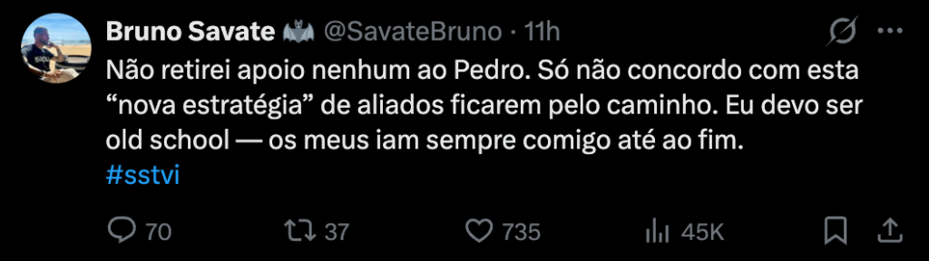 O comentário do veterano dos reality shows levou muitos fãs a acreditarem que tinha retirado o apoio a Pedro Jorge. No entanto, Savate já reagiu e fez um esclarecimento: “Não retirei apoio nenhum ao Pedro. Só não concordo com esta “nova estratégia” de aliados ficarem pelo caminho. Eu devo ser old school — os meus iam sempre comigo até ao fim.” De recordar que Bruno Savate está a apoiar nesta edição para além de Pedro Jorge, o Leandro.