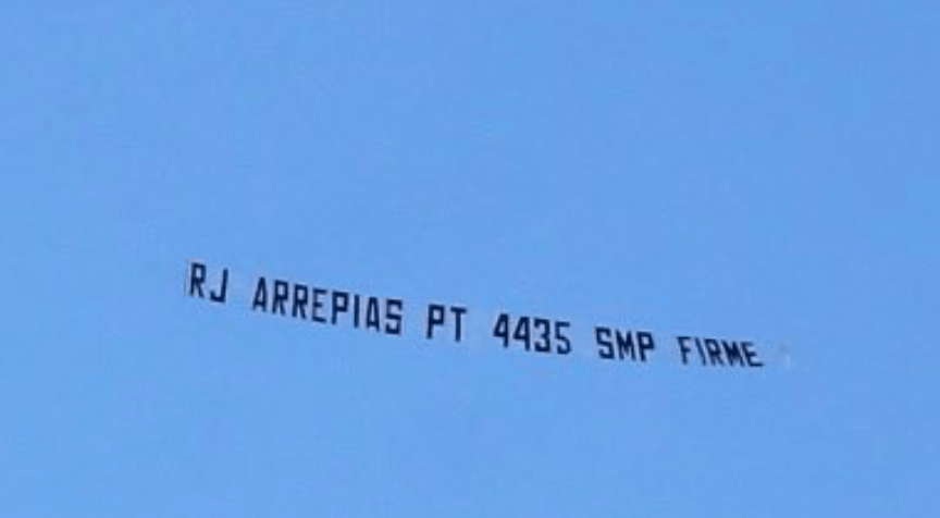 Na faixa podia ler-se : “RJ ARREPIAS PT. 4435 SMP FIRME“, escusado será dizer que mal se ouviu o avião sobrevoar a casa, a VOZ avisou os ocncorrentes para entrarem dentro de casa.