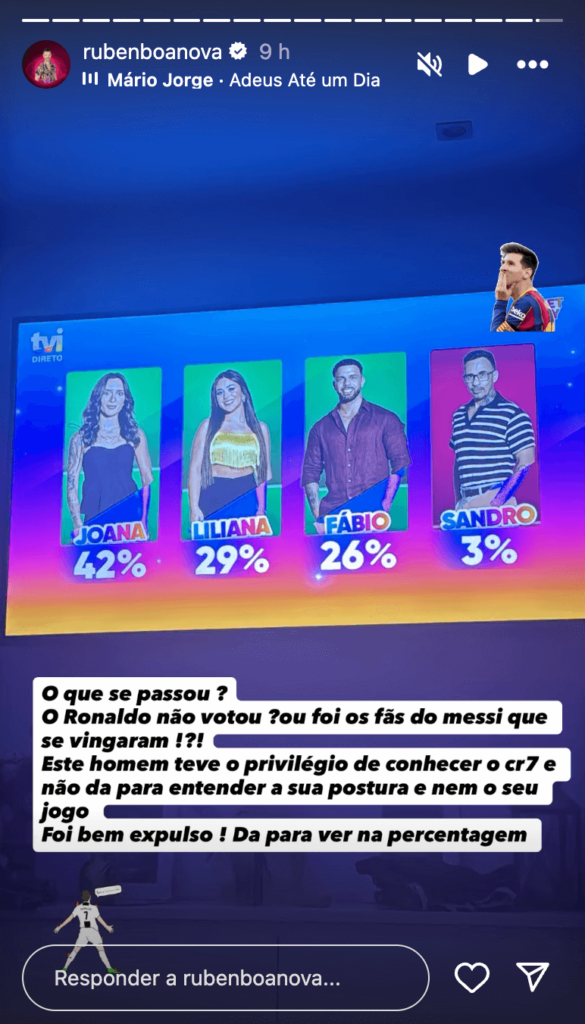 “Este homem teve o privilégio de conhecer o cr7 e não da para entender a sua postura e nem o seu jogo.”, lamentou Rúben Boa Nova, que aplaudiu a decisão do público: “Foi bem expulso! Dá para ver na percentagem”.