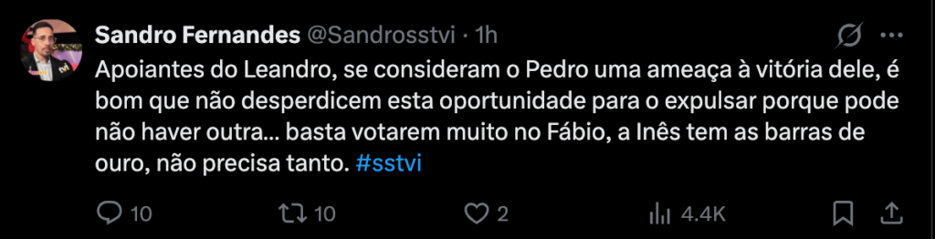 Sandro deixou algumas ‘dicas’ à Team Leandro, apelando pelo voto a Fábio: “Apoiantes do Leandro, se consideram o Pedro uma ameaça à vitória dele, é bom que não desperdicem esta oportunidade para o expulsar porque pode não haver outra… basta votarem muito no Fábio, a Inês tem as barras de ouro, não precisa tanto.”
