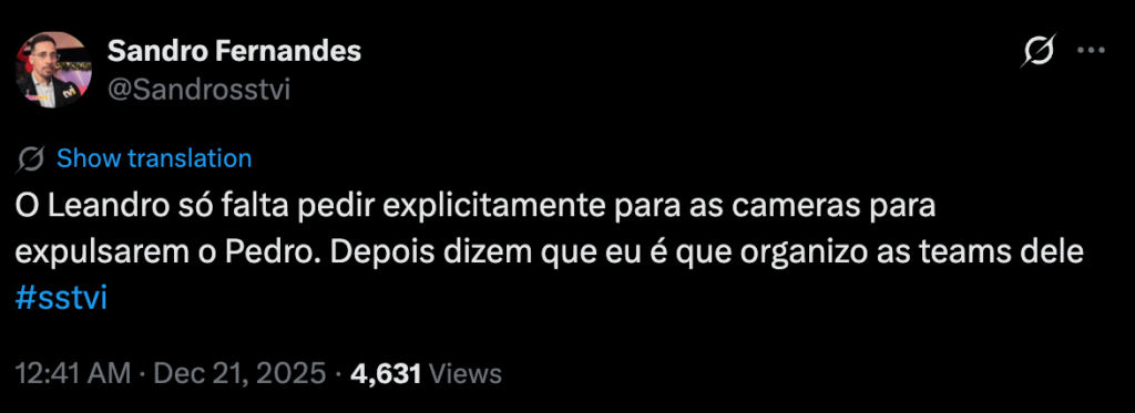 Cá fora, a disputa está igualmente feroz, com familiares e teams de apoio a mobilizarem-se para levar os seus favoritos à vitória. Sandro Fernandes, ex-concorrente do formato, continua atento a todos os desenvolvimentos e voltou a incendiar as redes sociais comentando as investidas de Leandro contra Pedro, deixando novas farpas dirigidas ao concorrente e a quem o criticou por apelar ao voto estratégico para expulsar o marido de Marisa.