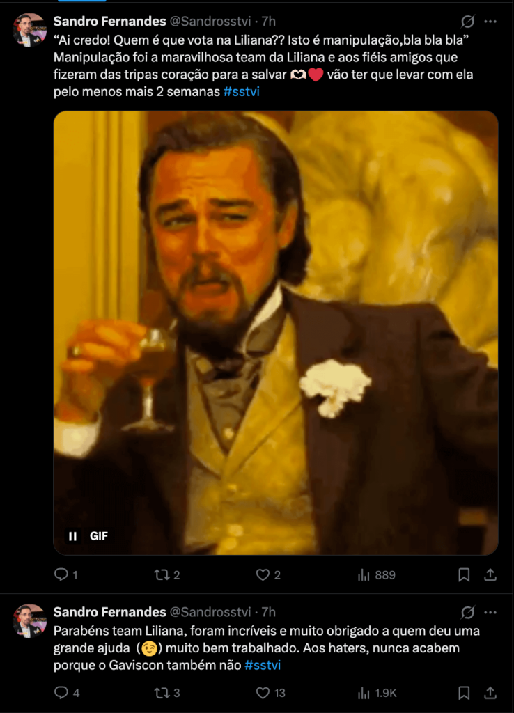 Sandro não se ficou e acrescentou: “‘Ai credo! Quem é que vota na Liliana?? Isto é manipulação,bla bla bla’. Manipulação foi a maravilhosa team da Liliana e aos fiéis amigos que fizeram das tripas coração para a salvar. Vão ter que levar com ela pelo menos mais 2 semanas”.