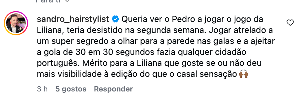 Sandro deixou de seguida vários elogios ao jogo de Liliana, que tem sido uma das grandes protagonistas do reality show: “Mérito para a Liliana que goste se ou não deu mais visibilidade à edição do que o casal sensação”.