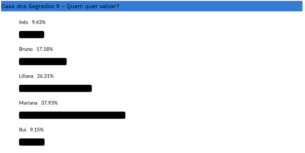 Vamos espreitar como anda a sondagem esta quarta-feira, 22 de outubro. Com 37,93 % dos votos, Mariana é a concorrente mais votada para salvar, seguida de Liliana, com 26,31% dos votos e Bruno com 17,18% dos votos. Inês e Rui são os menos votados para salvar com 9,43% e 9,15% dos votos, respetivamente.
