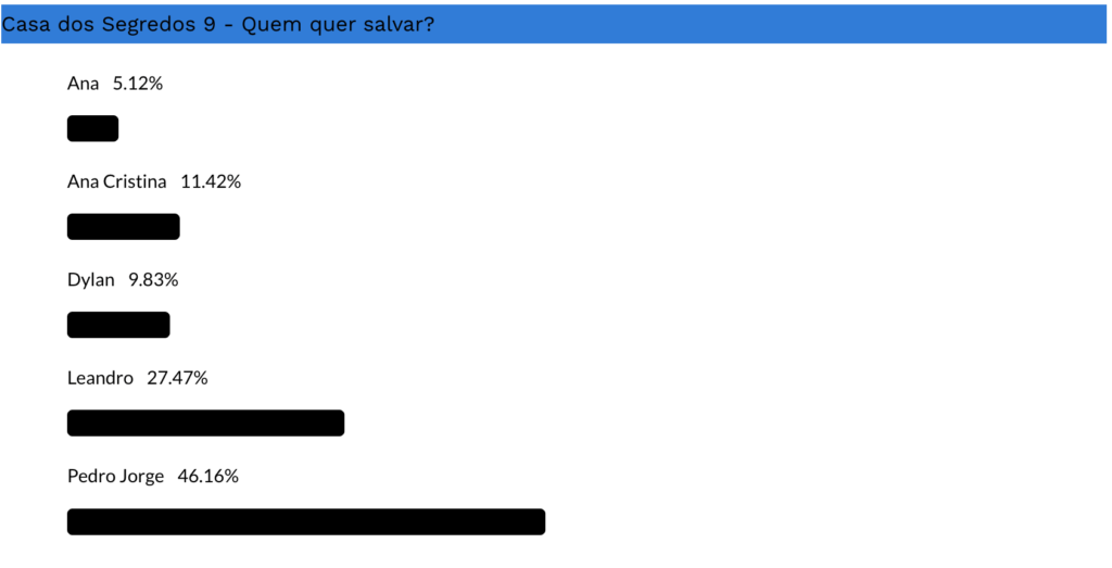 Vamos espreitar como anda a sondagem esta quinta-feira, 13 de novembro. Com 46,16% dos votos, Pedro Jorge é o concorrente mais votado para salvar, seguido de Leandro com 27,47% dos votos e Ana Cristina com 11,42% dos votos. Entre os menos votados temos, Dylan com 9,83% dos votos e Ana com 5,13% dos votos.
