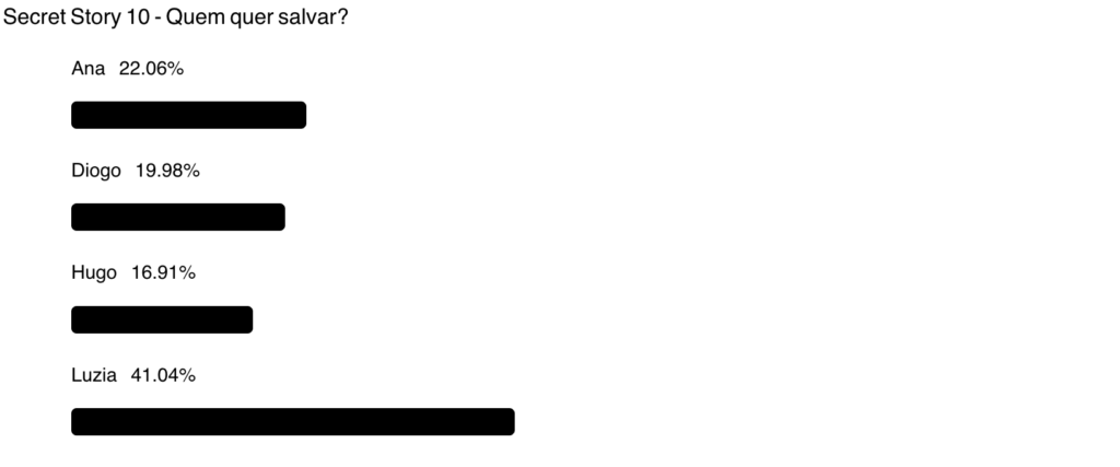 4.º Hugo — 16,91% Hugo surge na última posição com 16,91%, uma descida considerável face ao início da semana, que estava confortavelmente em segundo lugar. O comportamento desta semana, nomeadamente o momento em que gritou na cara de Ana, parece estar a cobrar a sua fatura junto do público. Hugo é neste momento o segundo favorito à expulsão e a distância para Diogo, de apenas 3 pontos percentuais, torna o resultado de domingo absolutamente imprevisível.