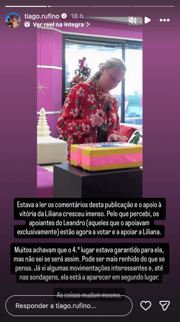 Tiago Rufino começou por destacar que após a saída de Leandro: “O apoio à vitória da Liliana cresceu imenso.”, segundo o ex-concorrente, os apoiantes de Leandro podem aliar-se à Team de Liliana: “Pelo que percebi, os apoiantes do Leandro (aqueles que o apoiavam exclusivamente) estão agora a votar e a apoiar a Liliana.”