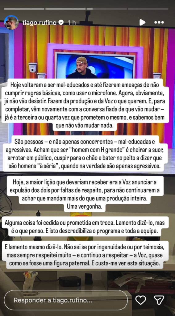 Tiago Rufino apontou de seguida o dedo à produção que foi mais uma vez benevolente com os dois concorrentes: “Hoje, a maior lição que deveriam receber era a Voz anunciar a expulsão dos dois por faltas de respeito, para não continuarem a achar que mandam mais do que uma produção inteira. Uma vergonha. Alguma coisa foi cedida ou prometida em troca. Lamento dizê-lo, mas é o que penso. E isto descredibiliza o programa e toda a equipa. E lamento mesmo dizê-lo. Não sei se por ingenuidade ou por teimosia, mas sempre respeitei muito – e continuo a respeitar – a Voz, quase como se fosse uma figura paternal. E custa-me ver esta situação.”.
