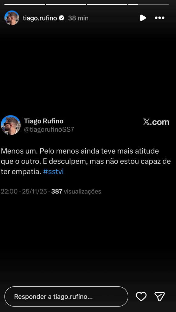 Por fim, Tiago reagiu à desistência de Bruno: “Menos um. Pelo menos ainda teve mais atitude que o outro. E desculpem, mas não estou capaz de ter empatia.”