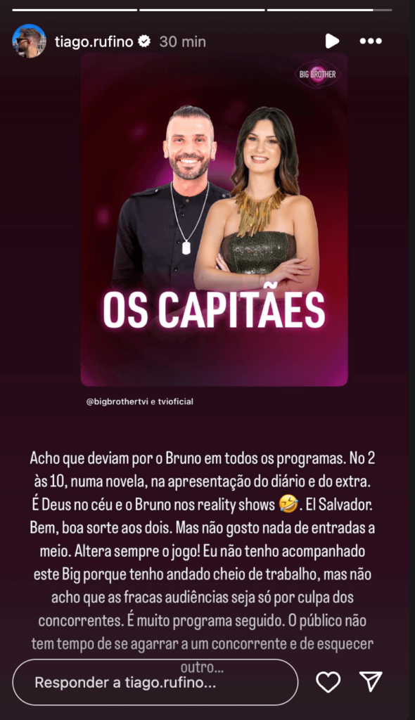 “Acho que deviam pôr o Bruno em todos os programas. No 2 às 10, numa novela, na apresentação do diário e do extra. É Deus no céu e o Bruno nos reality shows. El Salvador. Bem, boa sorte aos dois. Mas não gosto nada de entradas a meio. Altera sempre o jogo!”, começou por reagir Tiago Rufino.