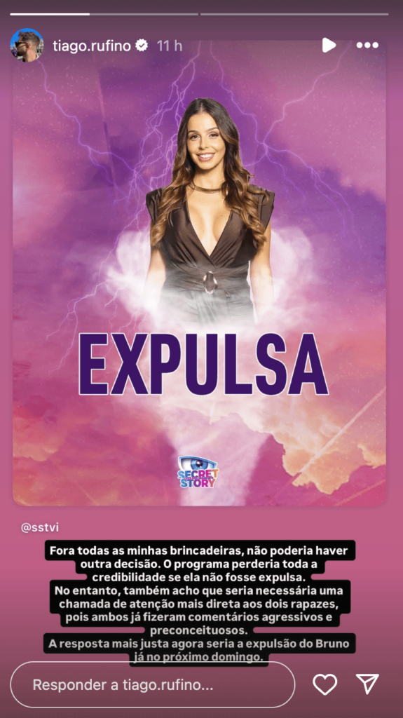 “Fora todas as minhas brincadeiras, não poderia haver outra decisão. O programa perderia toda a credibilidade se ela não fosse expulsa.”, começou por dizer Tiago Rufino.