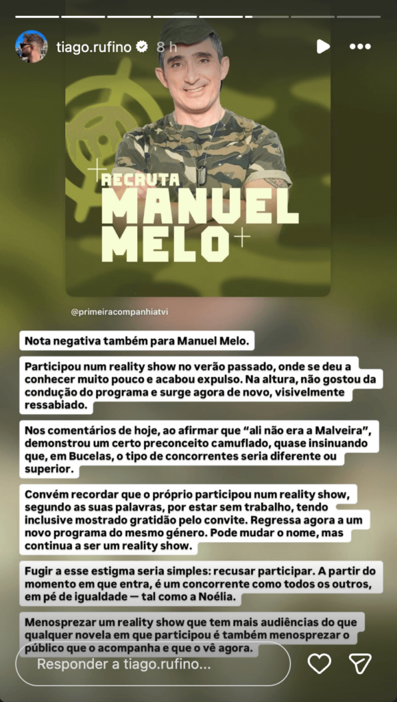 Tiago Rufino lamentou a postura dos outros recrutas: “Quanto aos outros, não percebo se vivem numa bolha de elite famosa que não vê reality shows ou se simplesmente não se apercebem de que a postura que estão a assumir só lhe vai dar ainda mais força.”