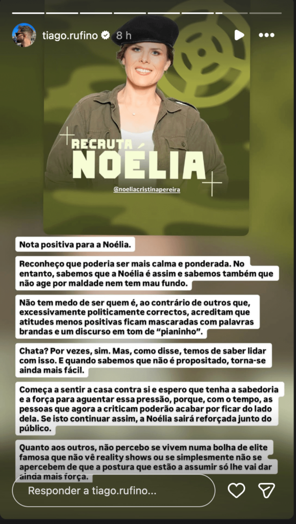 “Convém recordar que o próprio participou num reality show, segundo as suas palavras, por estar sem trabalho, tendo inclusive mostrado gratidão pelo convite. Regressa agora a um novo programa do mesmo género. Pode mudar o nome, mas continua a ser um reality show. Fugir a esse estigma seria simples: recusar participar. A partir do momento em que entra, é um concorrente como todos os outros, em pé de igualdade — tal como a Noélia. Menosprezar um reality show que tem mais audiências do que qualquer novela em que participou é também menosprezar o público que o acompanha e que o vê agora.”, rematou Tiago Rufino.
