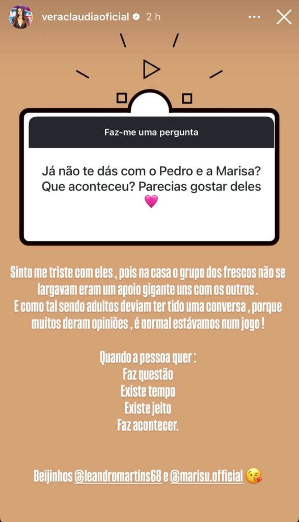 Questionada diretamente por um seguidor sobre o estado atual da relação com o casal, Vera não escondeu a mágoa que sente pelo afastamento: “Já não te dás com o Pedro e a Marisa? Que aconteceu? Parecias gostar deles.”