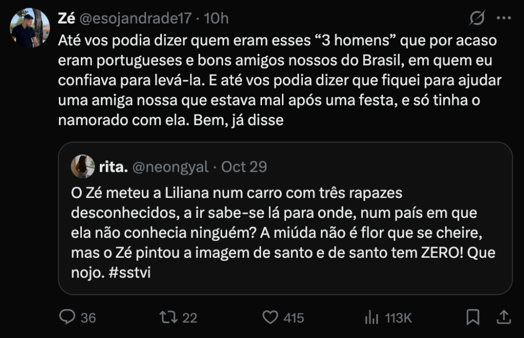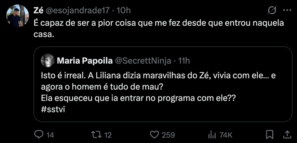 Entretanto, Zé já reagiu às acusações da ex-noiva e na rede social X podia ler-se: “É capaz de ser a pior coisa que me fez desde que entrou naquela casa.”, lamentou Zé.